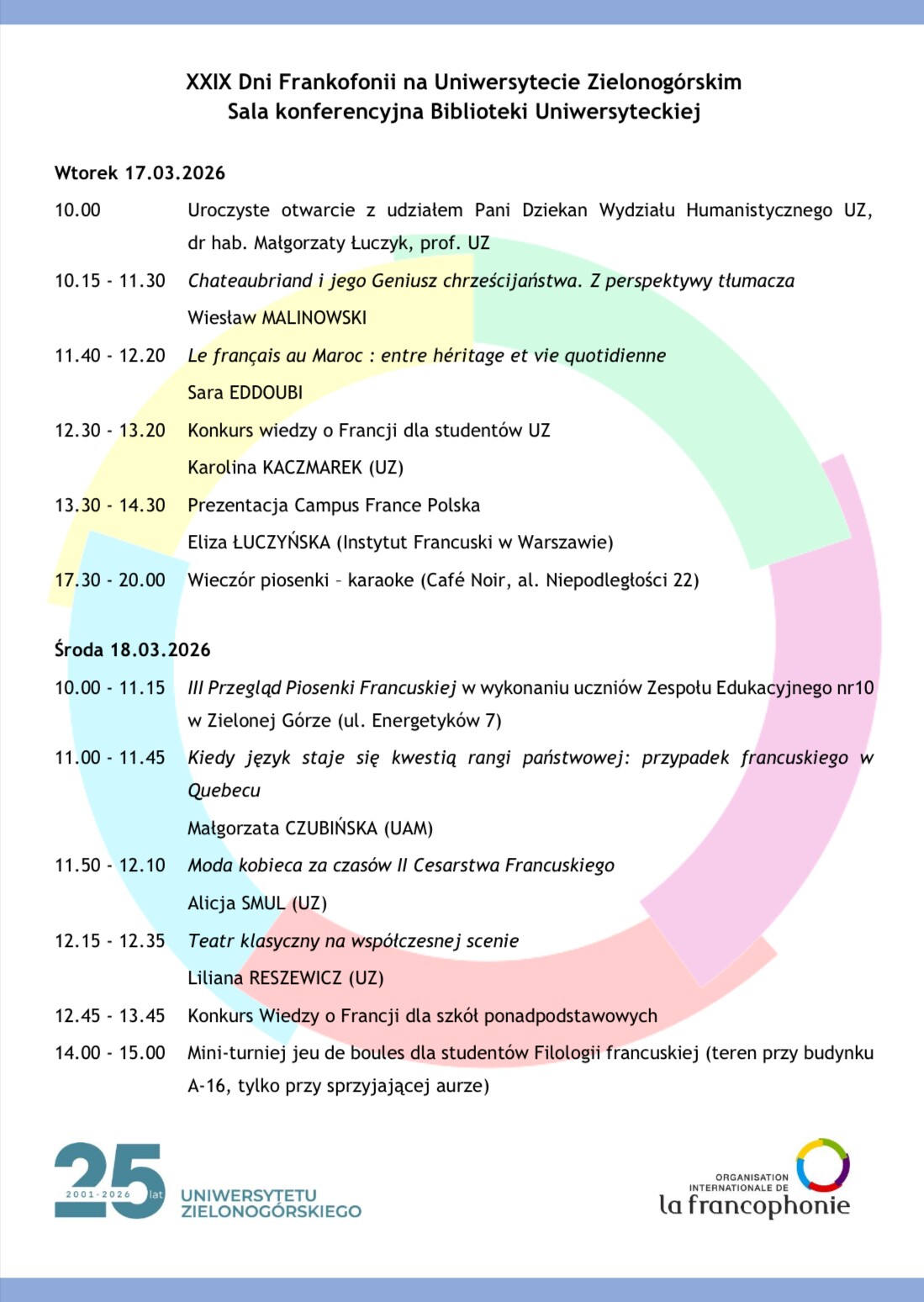 W dniach 17 i 18 marca 2026r. Pracownia Romanistyki Instytutu Neofilologii Uniwersytetu Zielonogórskiego zaprasza na XXIX edycję Międzynarodowych Dni Frankofonii w Zielonej Górze.